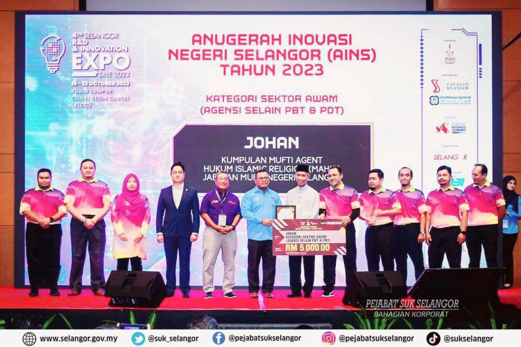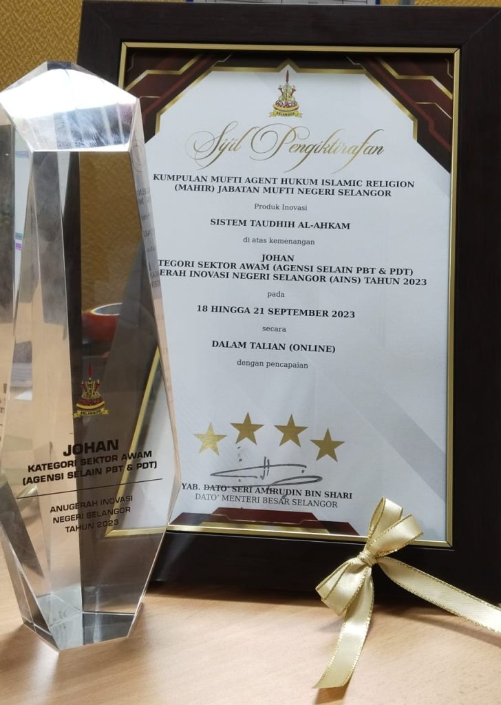 Produk inovasi Sistem TAUDHIH AL-AHKAM dari Kumpulan Mufti Agent Hukum Islamic Religion (MAHIR), Jabatan Mufti Negeri Selangor telah dinobatkan sebagai JOHAN di dalam pertandingan Anugerah Inovasi Negeri Selangor (AINS) Tahun 2023 dalam Kategori Sektor Awam (Agensi Selain PBT & PDT) yang telah diadakan pada 22 Oktober 2023 bersempena Majlis Penutupan 4th Selangor R&D And Innovation Expo (SRIE) Tahun 2023 di Conference Hall, Kuala Lumpur Convention Centre (KLCC).